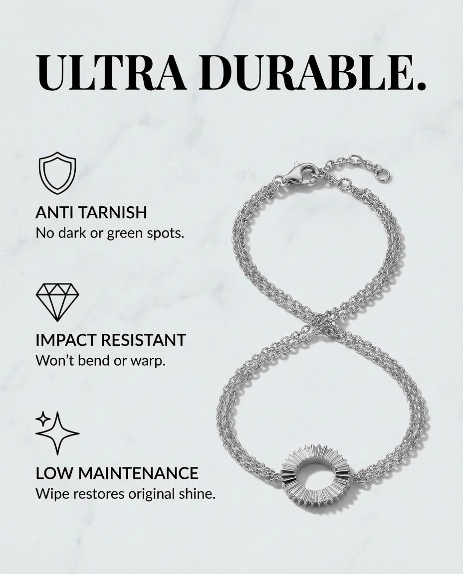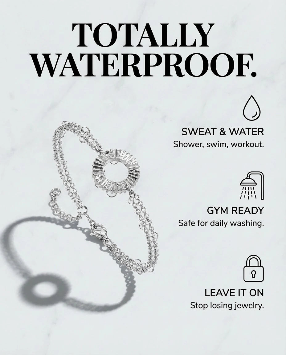Water- and sweat-safe, tarnish-resistant, with an adjustable clasp for a precise fit.