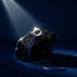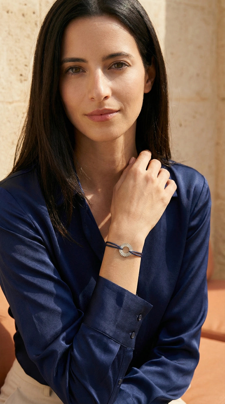 A finely ridged titanium halo anchors the piece, catching light against a midnight-blue double cord.