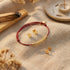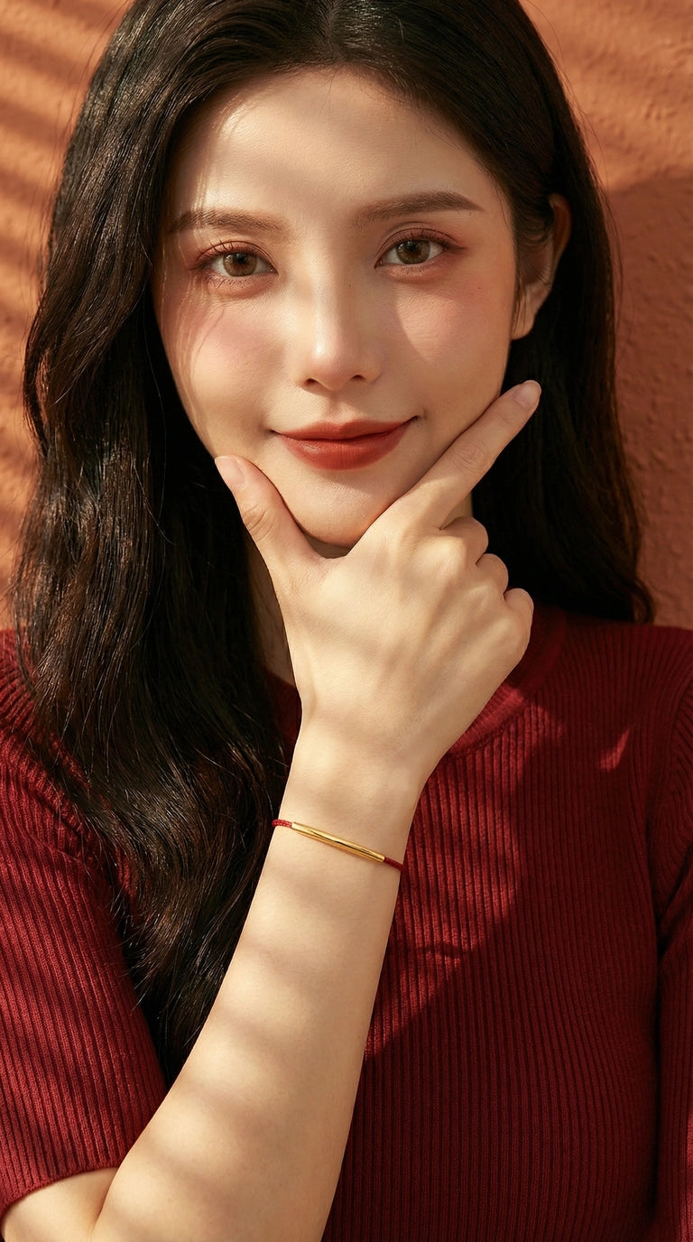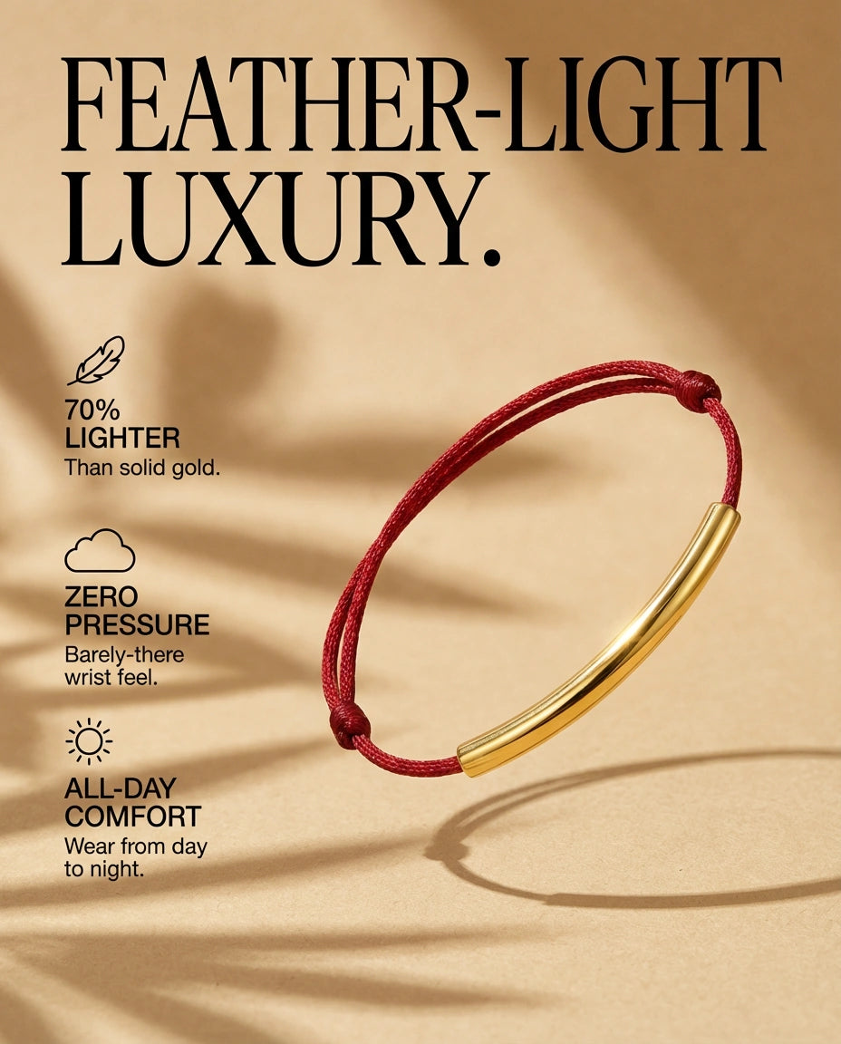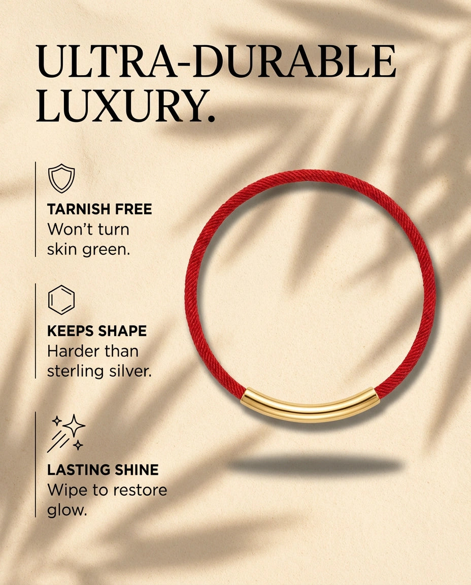 The Wish Bracelet centers a slim, mirror-finished titanium bar on a rich red cord, accented by a petite star.