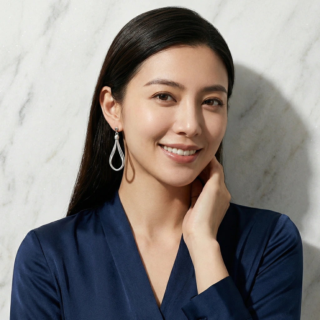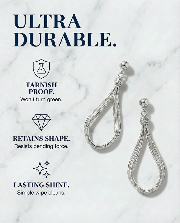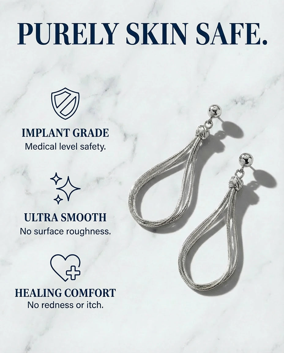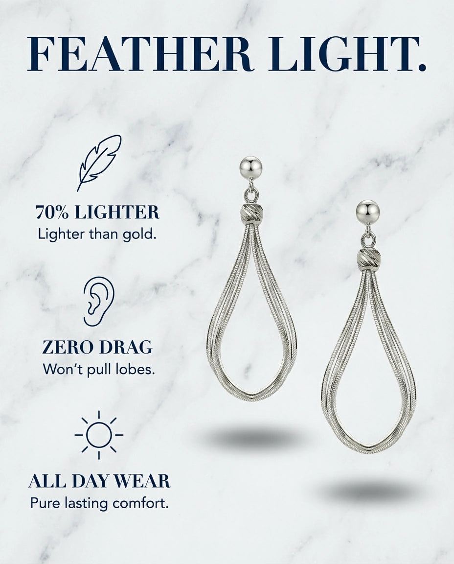 Multi‑strand titanium loops cinched at the crown form a refined teardrop that moves with you.