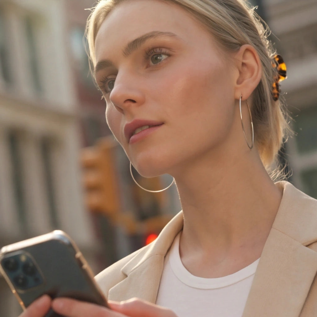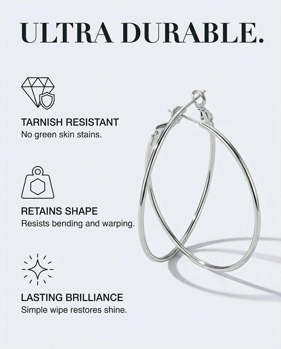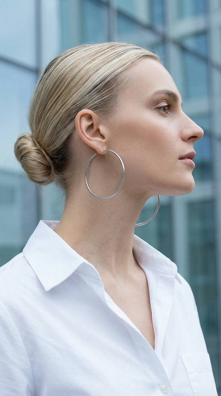 A crisp, mirror‑bright hoop that frames the face with effortless clarity.